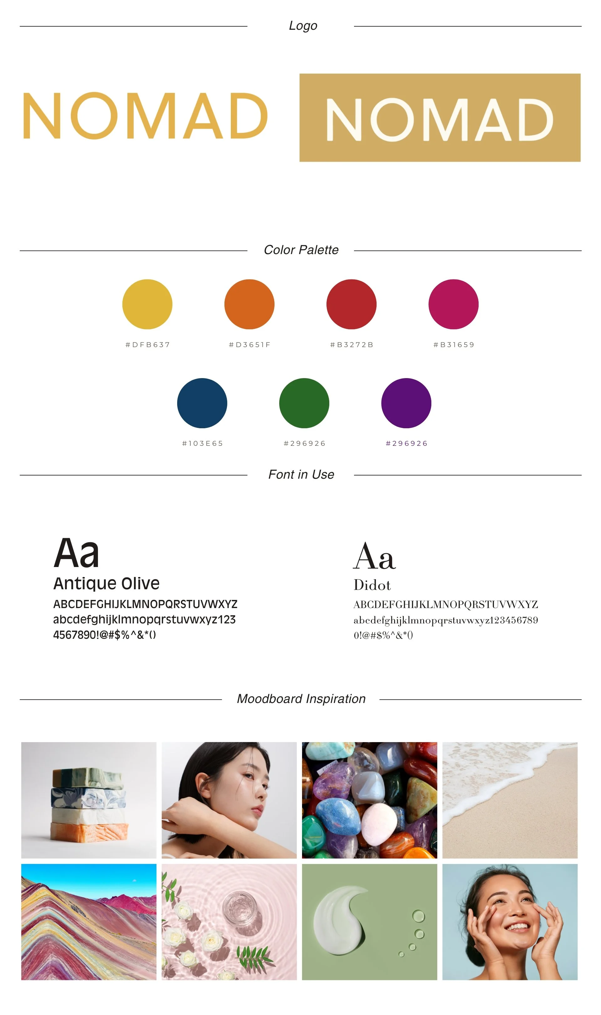 The visual identity combines warmth, vibrancy, and sophistication to evoke a sense of discovery and ritual, fostering a sense of anticipation and excitement. From rich ingredients to bold yet elegant packaging, Nomad celebrates skincare as a journey, where each step represents a moment of connection, indulgence, and transformation.